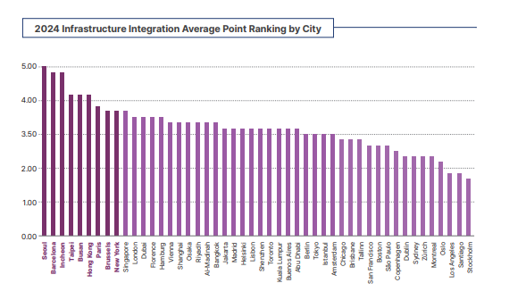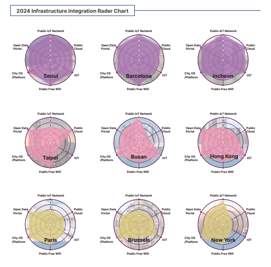 In this index report, the infrastructure necessary for the successful implementation of smart cities was analyzed from various perspectives. The study focused on 50 cities and examined key common infrastructure elements, including “City OS/Platform,” “Public IoT private networks,” “Public Wi-Fi,” “Public Cloud,” “Open Data Portal,” and “Integrated Operations Centers(IOC).” The characteristics and status of each infrastructure were collected and analyzed. The analysis revealed that these common infrastructures enable the collection, processing, analysis, and utilization of data across the entire city. Furthermore, advanced intelligent infrastructure, including AIoT (Artificial Intelligence + Internet of Things), was identified as a critical component that plays an essential role in achieving data-driven smart cities.